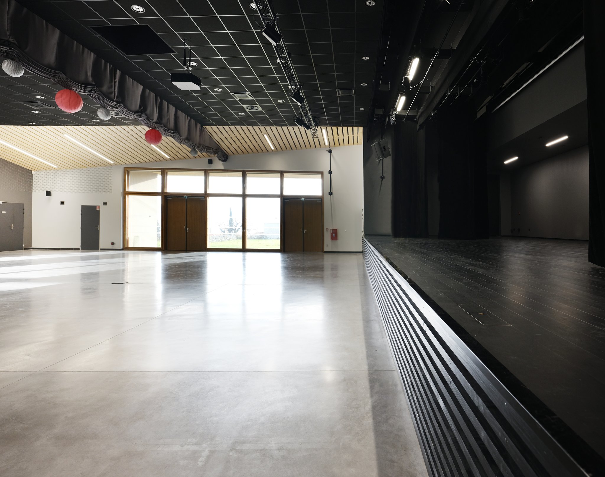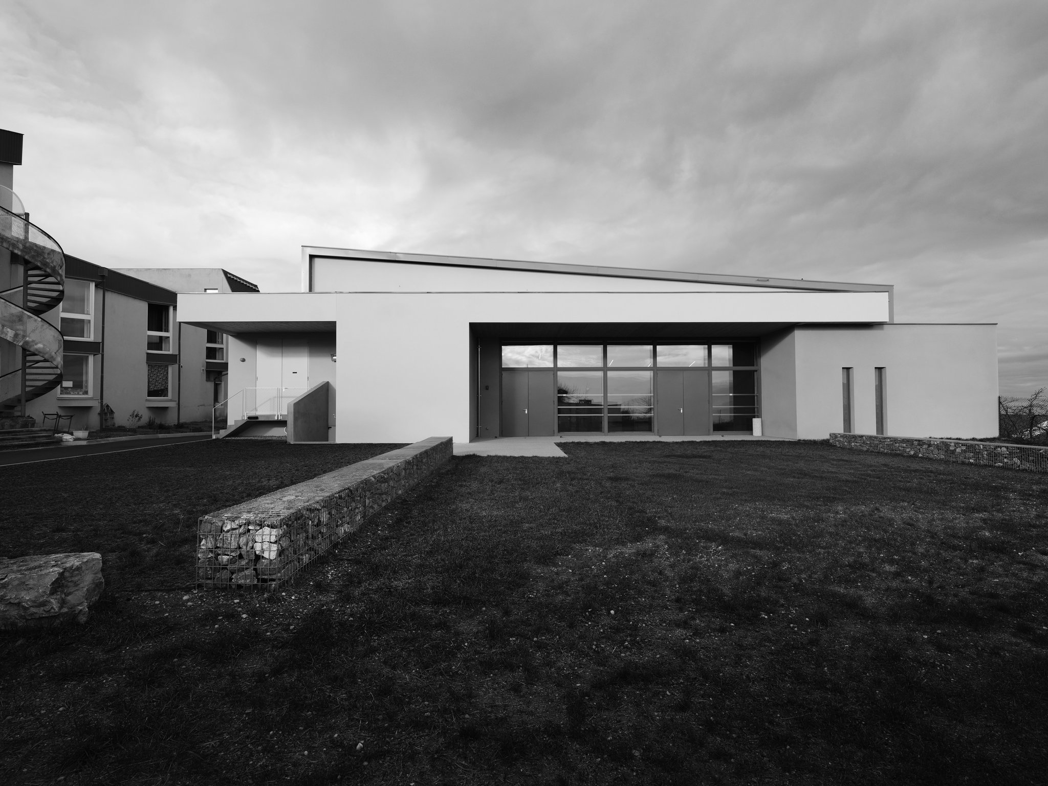 Salle de spectacle – St-Martin-la-Plaine (42) Toiture végétalisée / 2 salles principales / Chaufferie géothermie par sonde verticale Les toitures des 2 salles principales émergent d’un toit plat végétalisé. La toiture permet la lecture du fonctionnement du bâtiment (zones servies/ zones servantes). Ces 2 grandes toitures sont couvertes d’une toiture à joint debout. Cette écriture réinterprète les architectures de Sheds industriels encore présents sur Saint-Martin-La-Plaine. Le métal évoque la tradition qui a « forgé » l’image de la commune. L’ensemble est RT2012-20% et chauffé et rafraichit par une PAC géothermique, cela est également raccordé à la MJC existante. MAÎTRE D’OUVRAGE : Mairie de Saint-Martin-La-Plaine MISSION : Base + Exe CALENDRIER : Livraison Décembre 2018